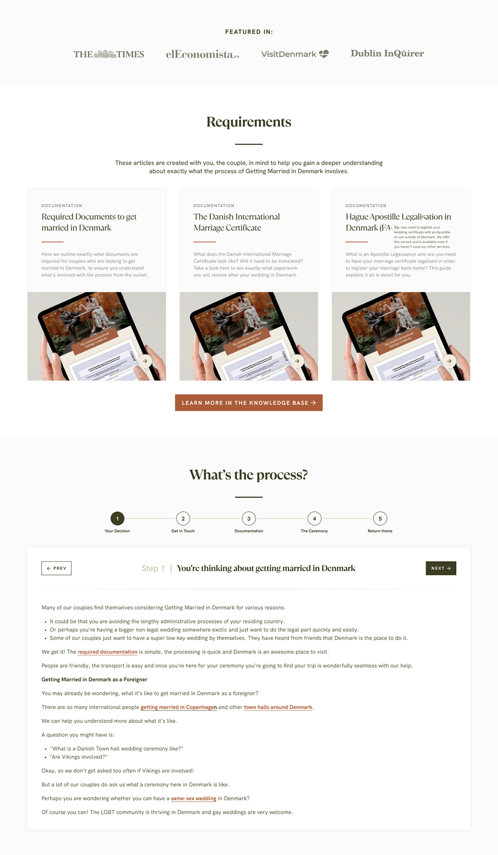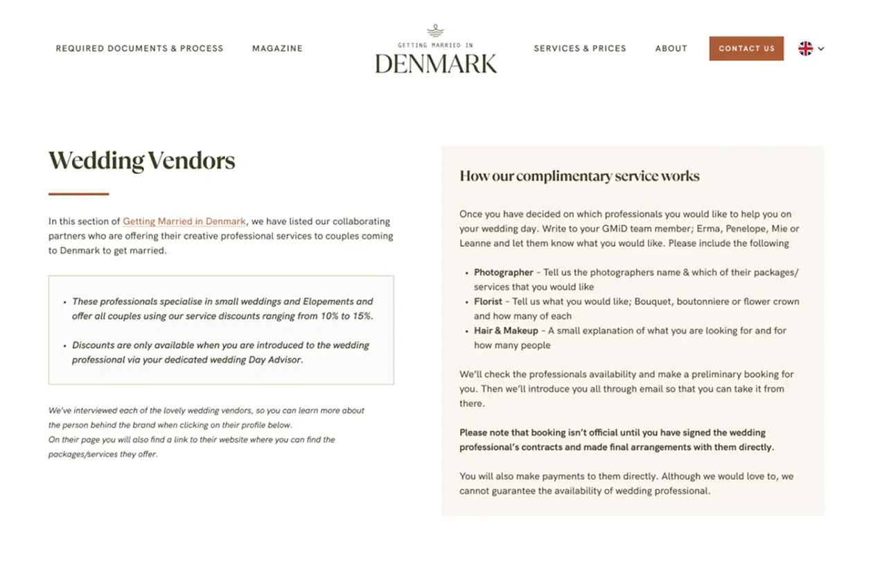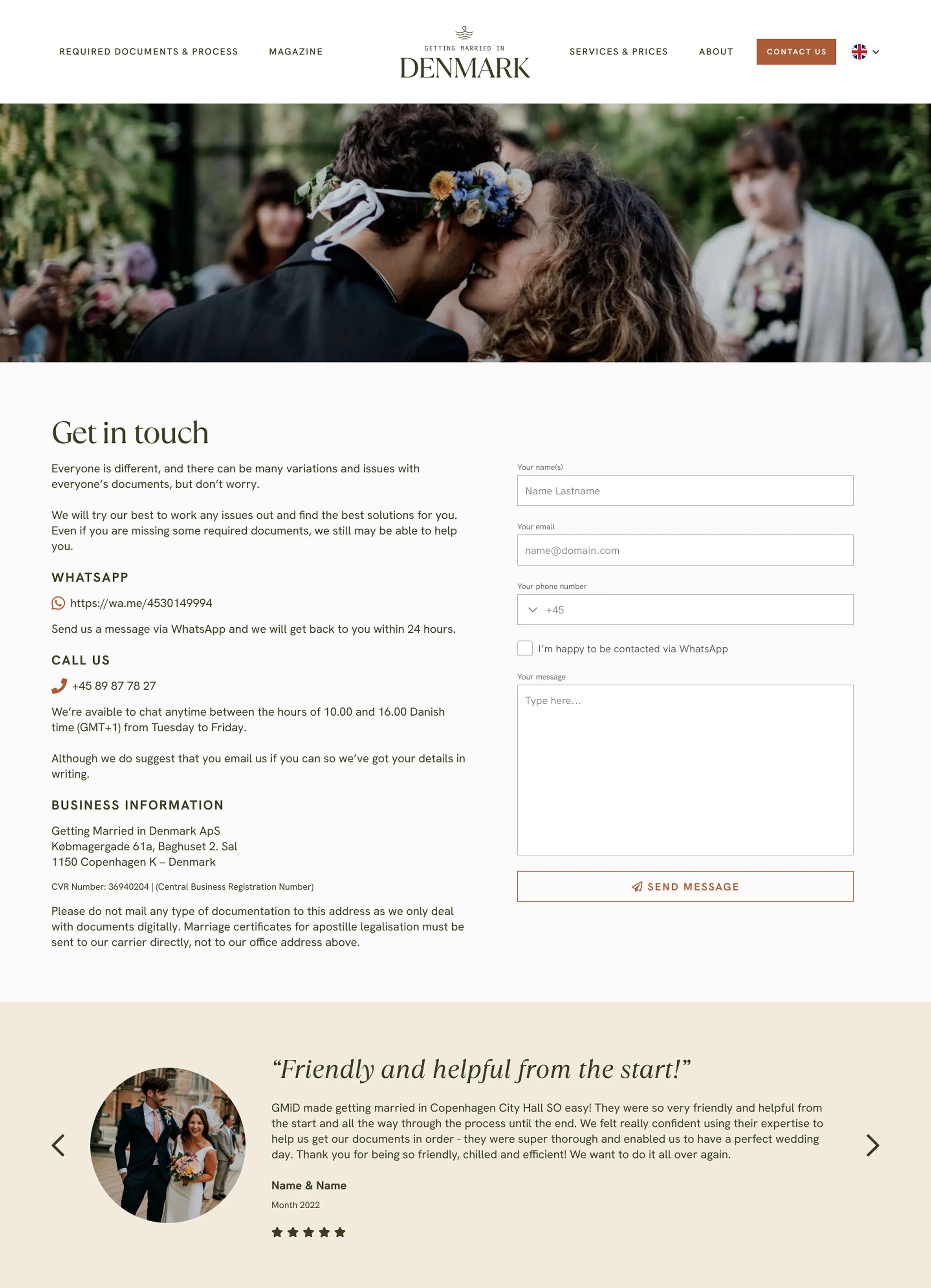 Potionnn developed a new website on WordPress, bringing a polished, professional look that resonated with the brand’s audience. By improving UX and performance, we delivered smoother navigation and a more intuitive flow for service selection. The new site not only simplified the experience for couples but also boosted conversions, establishing Getting Married in Denmark as the go-to service for stress-free weddings abroad.