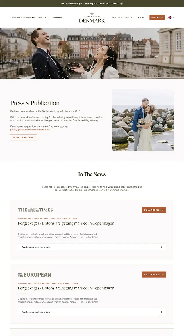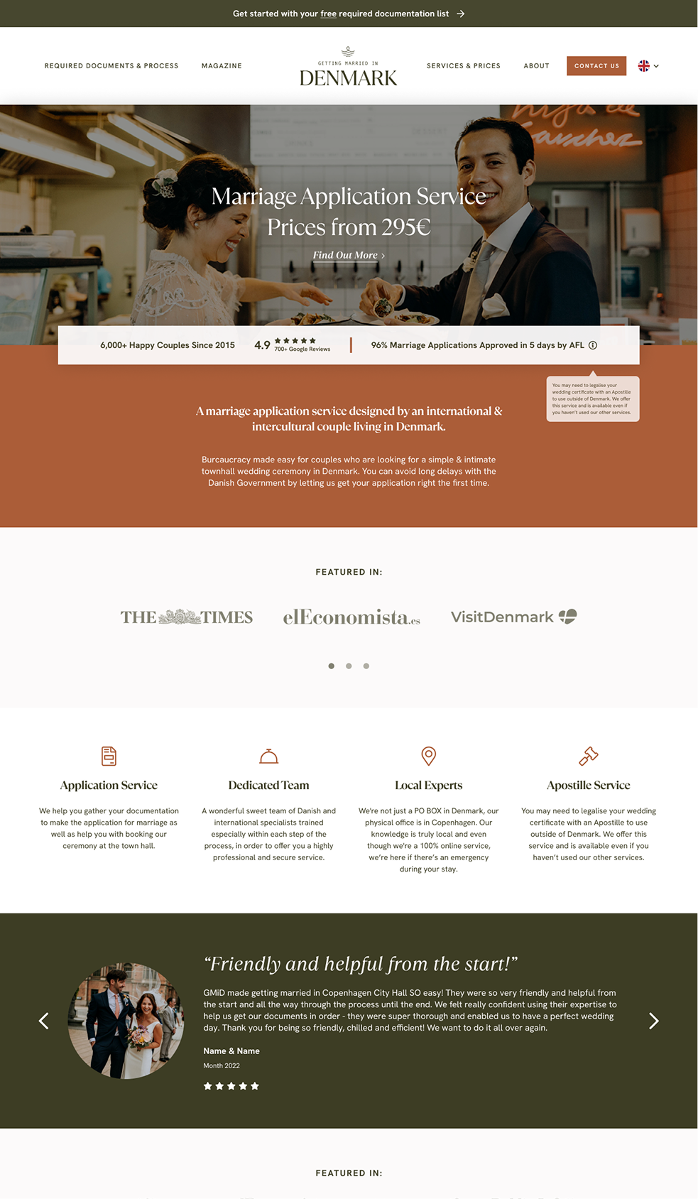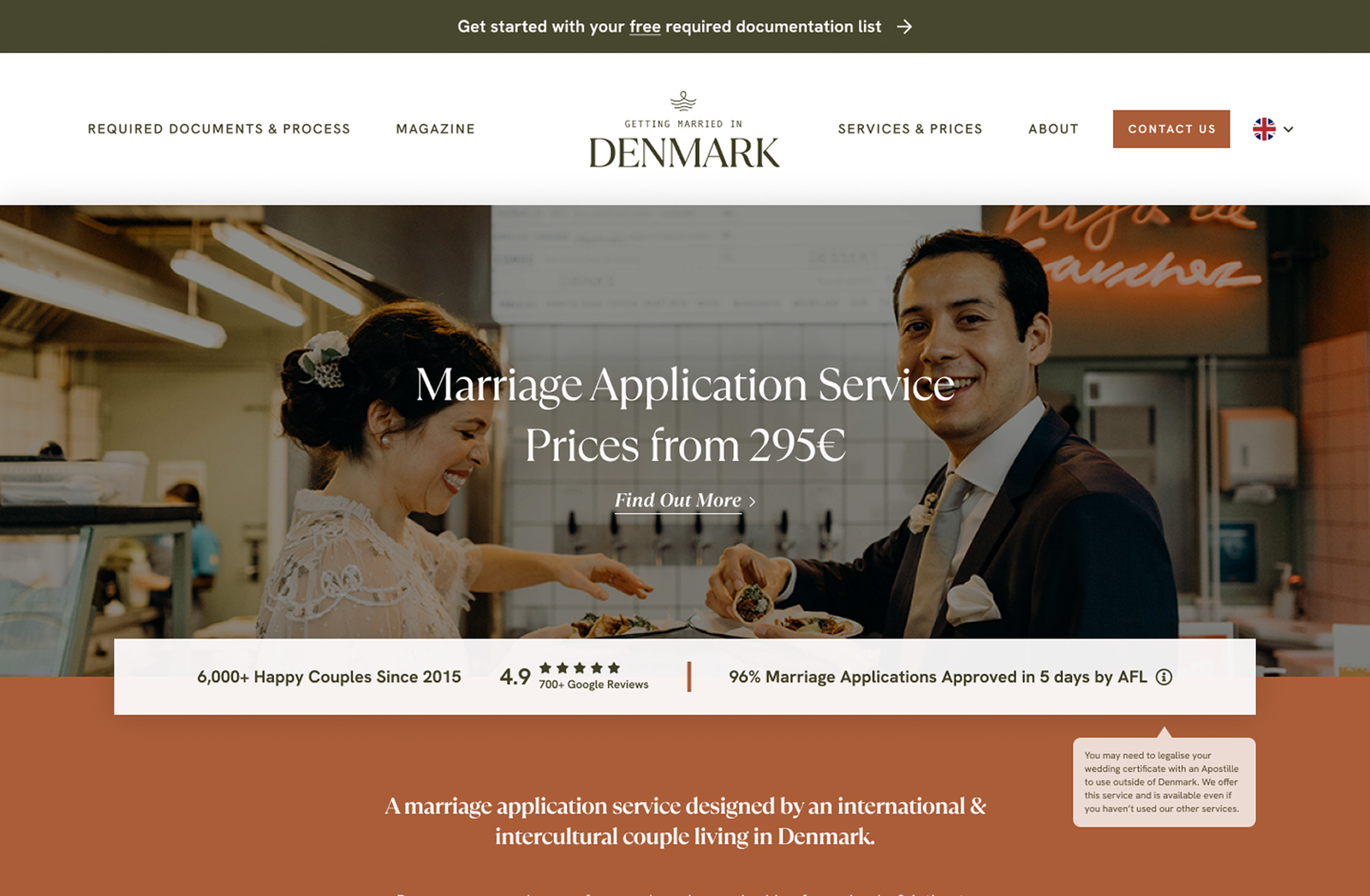 Getting Married in Denmark is a trusted service helping international and intercultural couples navigate the complex process of tying the knot abroad. They simplify legal paperwork, assist with documentation, and provide tailored service packages to ensure couples can focus on their special day instead of the bureaucracy.